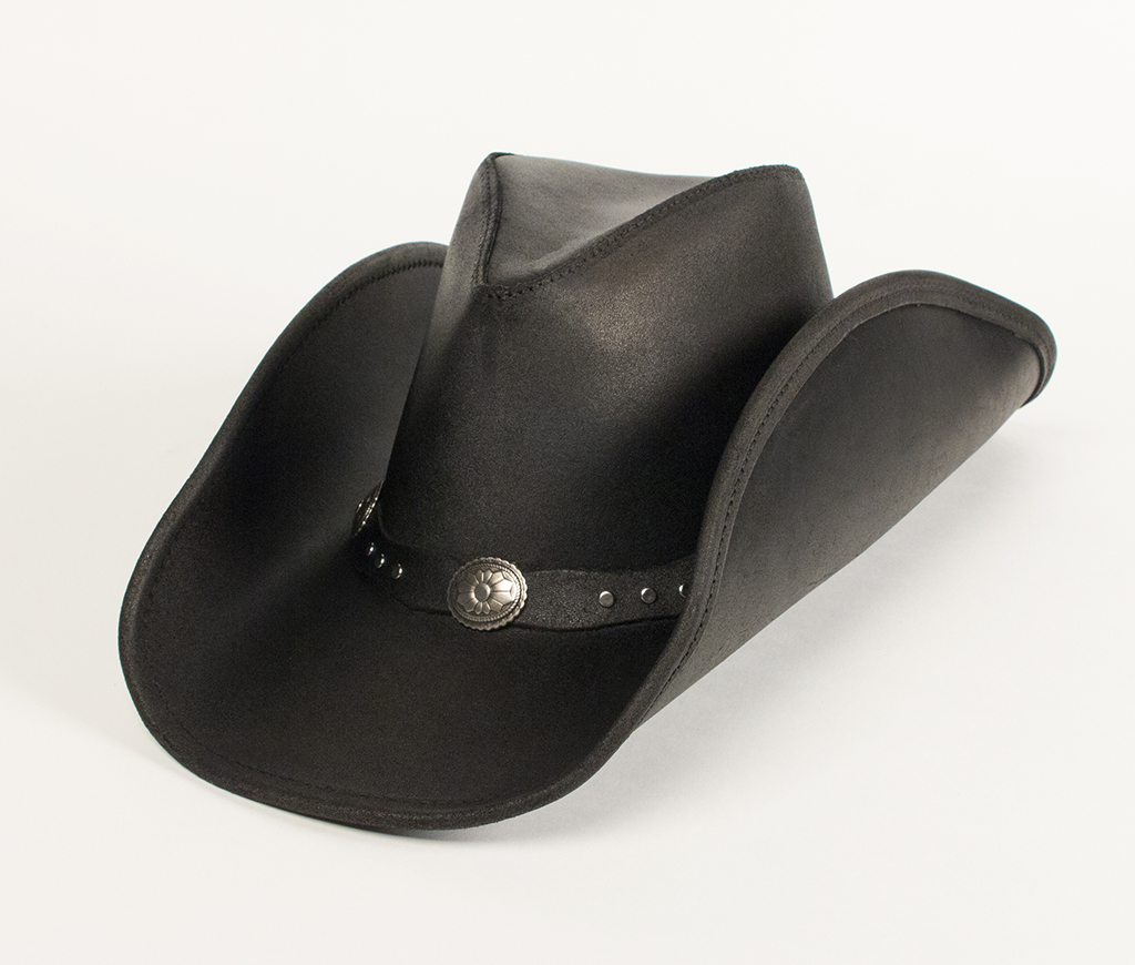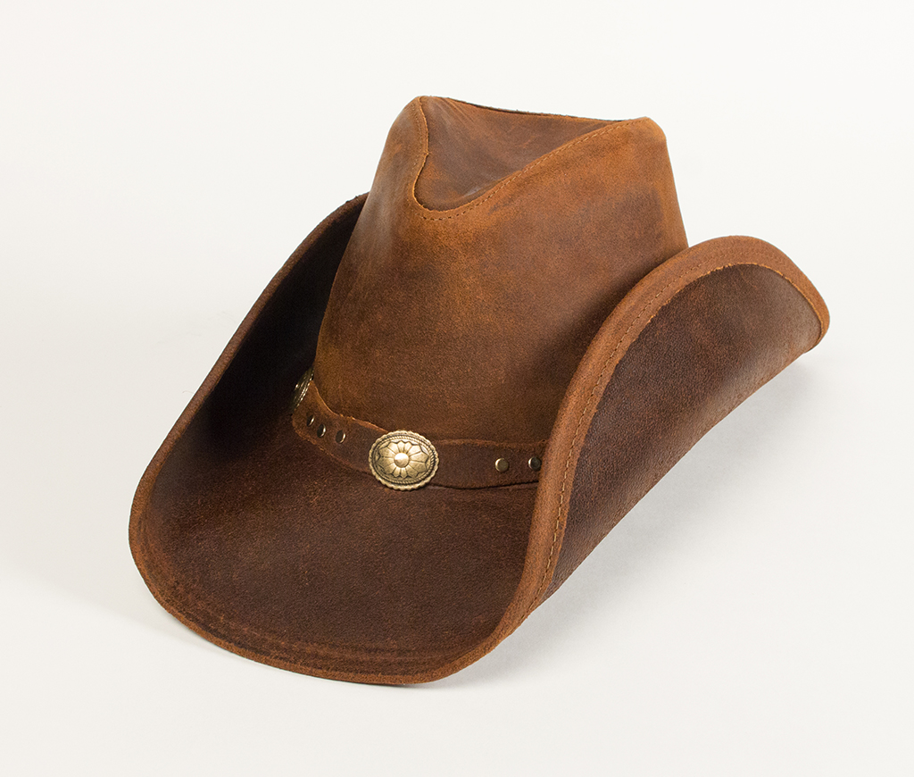 Ruff distressed leather. Great dude styling and metal concho band. Made with steel wire hidden in the edge of brim allowing for personalized shaping.